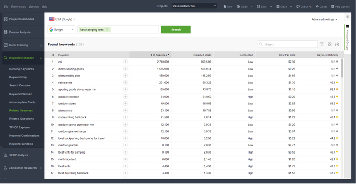 Pay attention to the metrics the tool provides: # of Searches and Keyword Difficulty. Try to select keywords with relatively high search volume but low keyword difficulty.