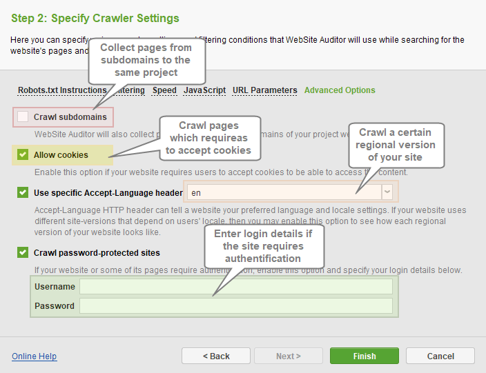 Crawler settings can be tailored to your needs and preferences: for instance, to collect or exclude certain sections of a site, crawl a site on behalf of any search engine bot, find pages that are unlinked from site, etc. To configure the settings, simply tick Enable expert options box once you are creating a project.