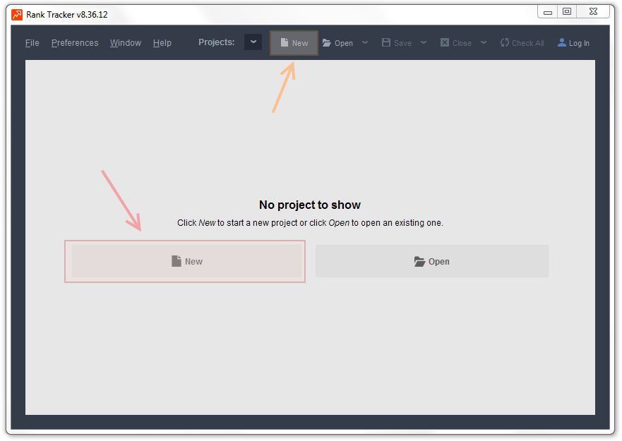 To start monitoring a site, you need to create a project in Rank Tracker. To do that you need to follow the wizard through a few simple steps. The wizard pops up automatically once you open the program. To activate it yourself, simply click New: