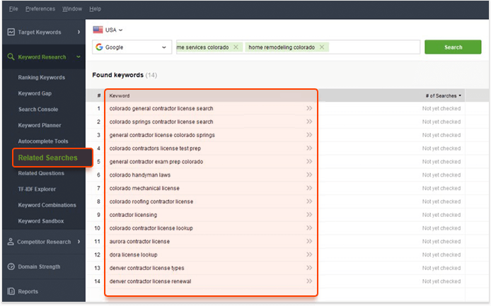 Next, I opened up Rank Tracker and used several of the keyword research software available — Autocomplete Tools, Related Searches, Related Questions, etc.