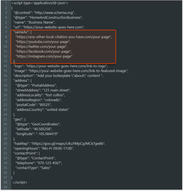Just as important as associating your business with known map entities, properly leveraging schema in your JSON-LD file can really help. Be sure to add any social profiles in the "sameas" field as well as specifying the schema type as "local business."