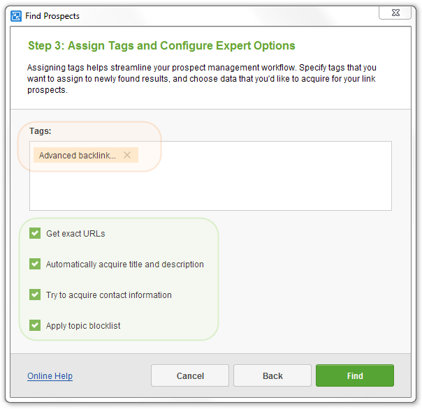 In step 3, you can pre-assign Tags, and set the app to automatically acquire Title and Description, Contact details (if possible), and get Exact URLs rather than Prospect Domains: