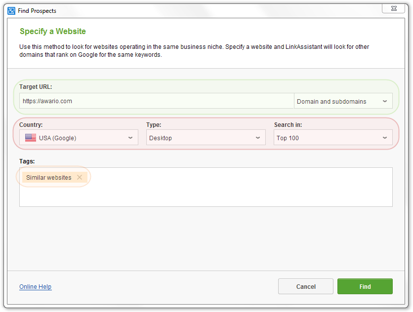 To wizard will let you set the target URL and search mode, the targeting settings (country, result type, the number of results to check), and, optionally, assign Tag(s) to the prospects-to-be-found for further management.
