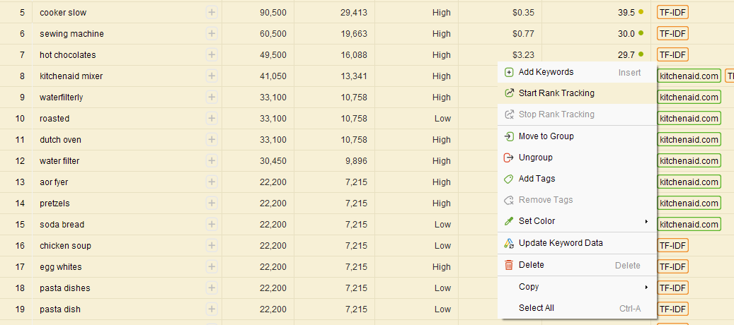 Now it’s time to move your set of keywords from the keyword sandbox for easier use. To do that, click on any keyword, press Ctrl+A (Cmd+A on MacOS), and select Start Rank Tracking.
