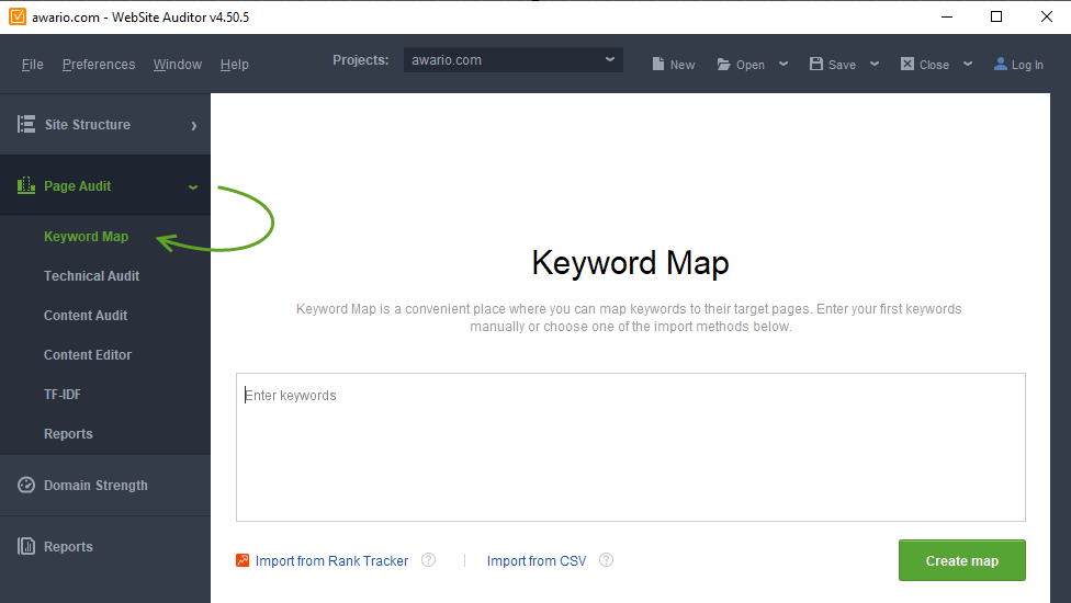 To begin planning, create a project for your website with WebSite Auditor or open an existing one, and jump to Page Audit > Keyword Map.