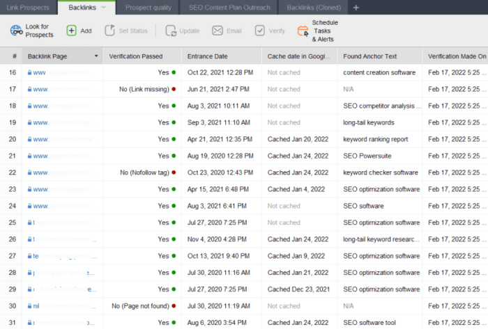 Third, there is a backlink verification tool which checks that all your backlinks are in place, dofollow or nofollow, what anchor words point at your domain, and the like. If you notice that a link has been changed or removed, you can reach out to the linking website straight from the tool, using the template with a request to check the issue on the linking side.