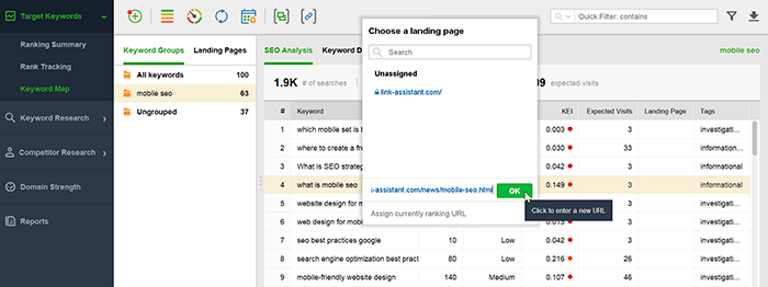 Download Rank TrackerIn the Keyword Map module, you can assign a keyword to a page (or several terms or the whole group at once): right-click on them and hit the Assign Keywords To Landing Page button.
