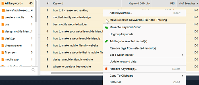 Whenever you find terms that are a good long-tail fit for your website, select them and hit Move Selected Keywords To Rank Tracking.