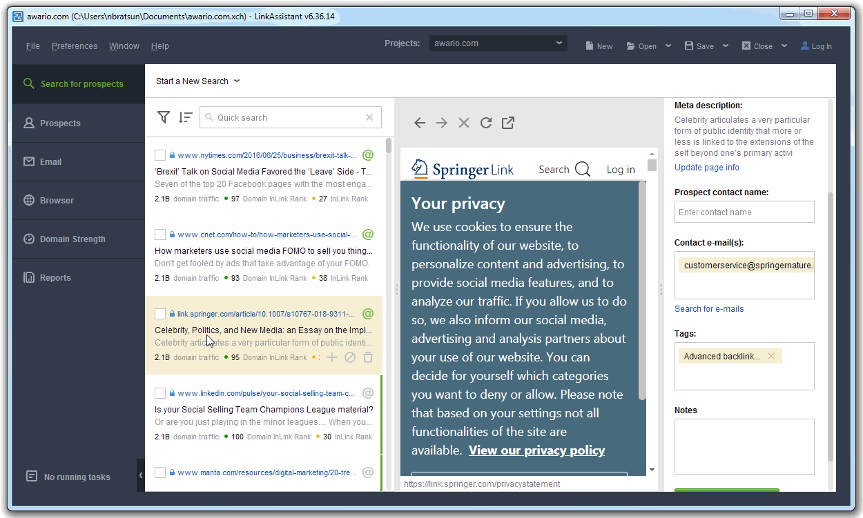 Once you've created a project and ran a search for potential Link Prospects, you'll see the list of found results along with their vital details: