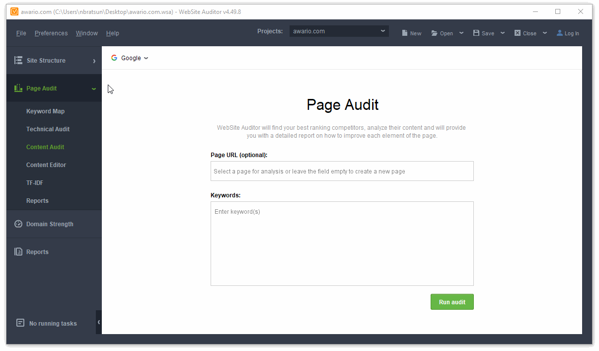 To analyze the on-page factors and keyword usage, go to Page Audit > Content Audit. If you haven’t analyzed any pages yet, you'll see the start screen.