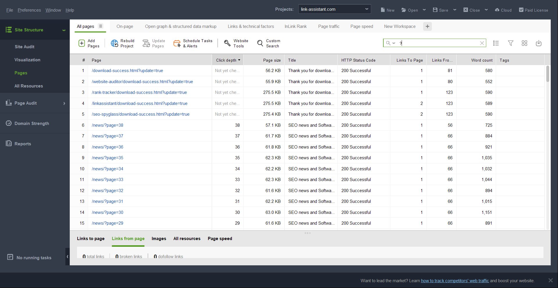 Use WebSite Auditor. In the Site Audit module, find the URLs report and check the number of dynamic pages. Scan the list of pages to spot any that aren’t supposed to be dynamic.