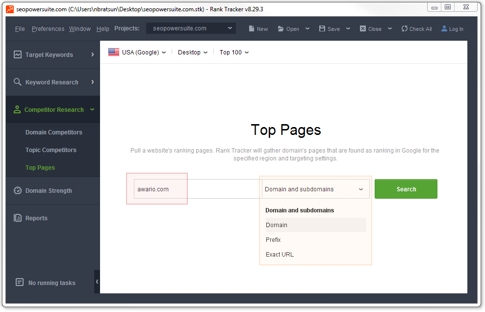 Type in the domain/directory URL for which you'd like to track down the top pages generating the most traffic. Choose one of the available search modes: