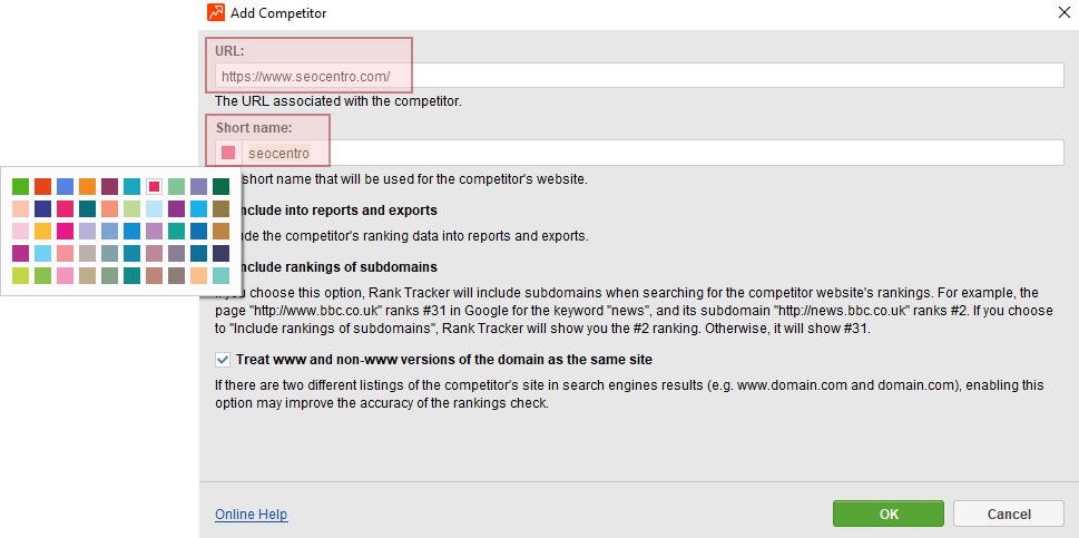 If you click Add, the wizard will ask you to enter the site URL, assign a short name to the competitor, optionally select a color label, and adjust the reporting and rank checking settings for it.